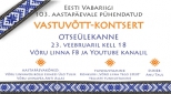 | Ürituse nimi: | Eesti Vabariigi 103. aastapäevale pühendatud Võru Linnavolikogu esimehe ja linnapea vastuvõtt - kutsetega / otseülekanne |