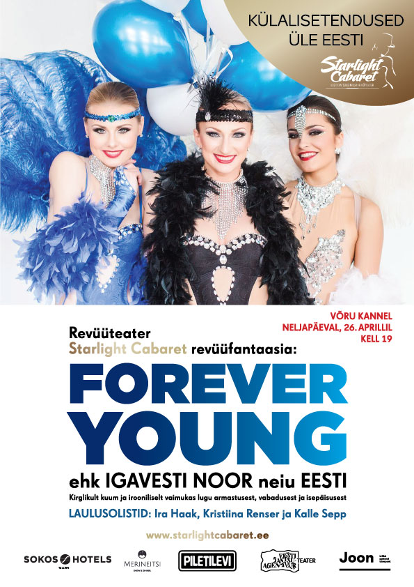 Eesti Vabariigi 100. sünnipäevale pühendatud revüülavastus “Forever Young”, räägib kirglikult kuuma ja irooniliselt vaimuka loo armastusest ja vabadusest, iseseisvusest ja isepäisusest. Meie lavastuse EESTI on igavesti noor naine, kes 100 aastat pärast sündi on alles 27-aastane.